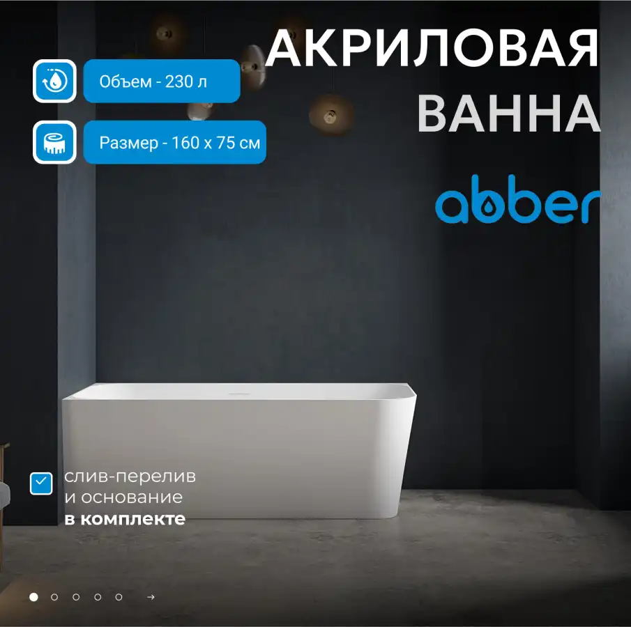 Акриловая ванна Abber 160х75 AB9331-1.6 L, отдельностоящая, в комплекте слив-перелив и каркас, Белая глянцевая.