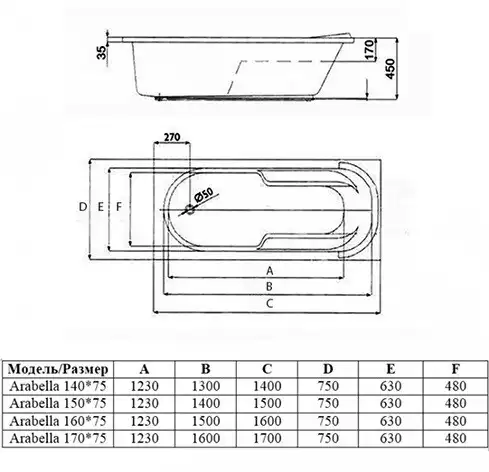 Акриловая ванна Alba Spa ARABELLA 170х75 см, ВПР0110000100, Белая