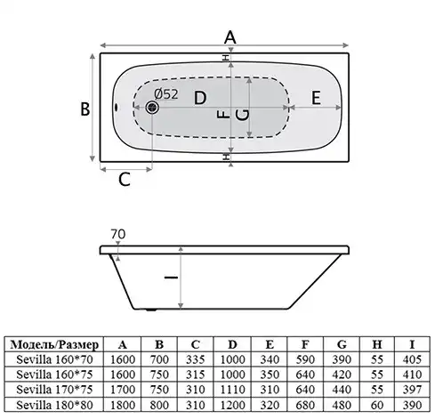 Акриловая ванна Alba Spa SEVILLA 170х75 прямоугольная, Белая. Опорная конструкция и слив-перелив приобретаются отдельно.