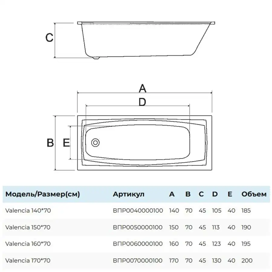 Акриловая ванна Alba Spa Valencia 150х70 прямоугольная ВПР0050000100, Белая. Опорная конструкция и слив-перелив приобретаются отдельно.