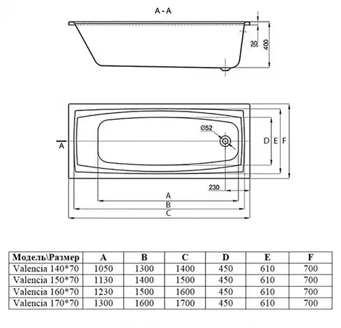 Акриловая ванна Alba Spa VALENCIA 160х70 прямоугольная, Белая. Опорная конструкция и слив-перелив приобретаются отдельно.