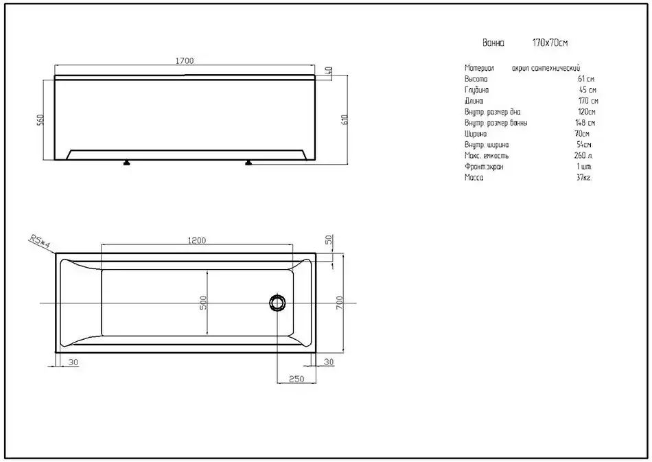 Ванна изготовлена из сантехнического акрила ALTUGLAS.
