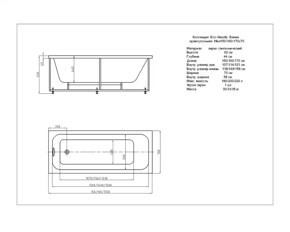 Акриловая ванна Aquatek Мия 160х70, Eco-friendly MIY160-0000001, Белая, без фронтального экрана, без слива-перелива, без опоры (каркаса).