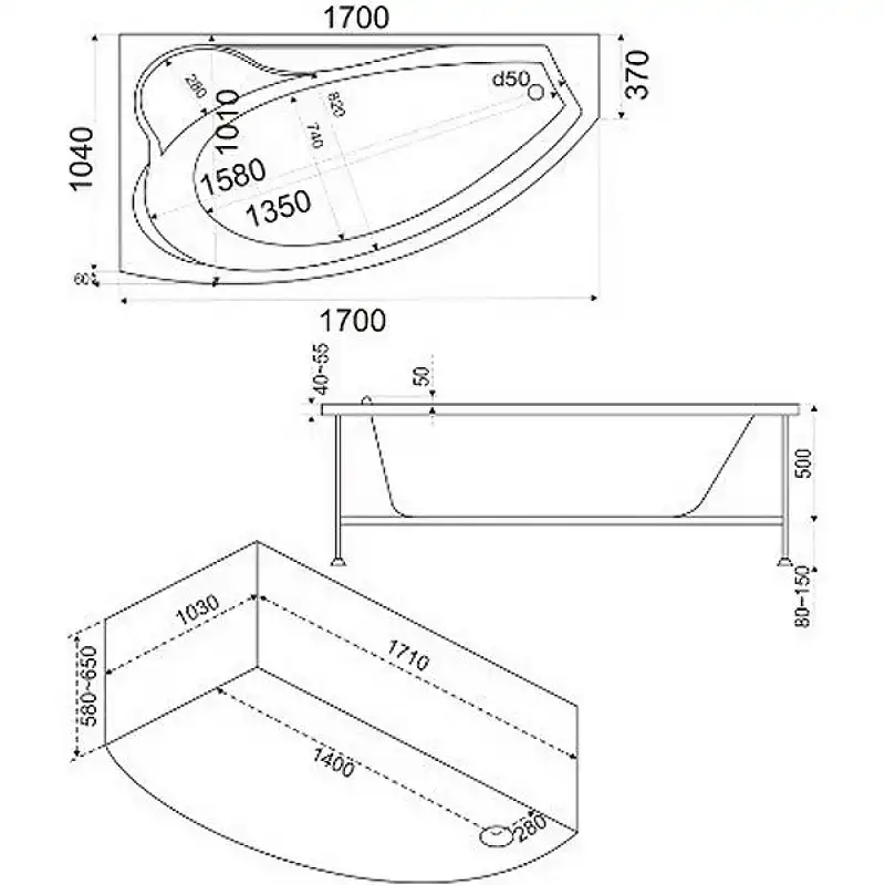 Комплектация: ванна на металлическом каркасе, без слив-перелива и фронтального экрана.