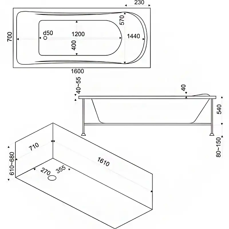 Акриловая ванна Bas Стайл 160х70 + разборный каркас. Слив-перелив заказывается отдельной позицией и не входит в комплект.