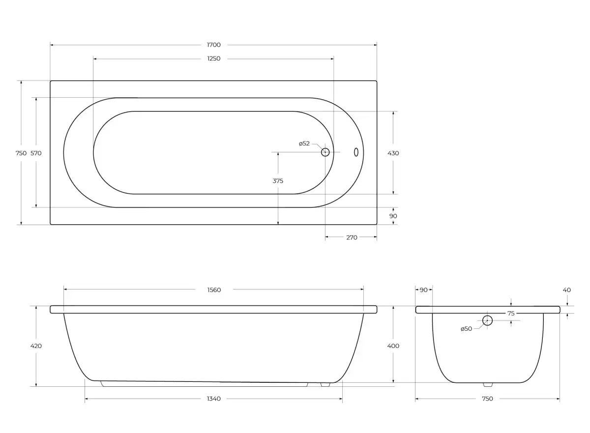 Акриловая ванна Cezares PIAVE, размер 170х75 см, прямоугольная, Белая