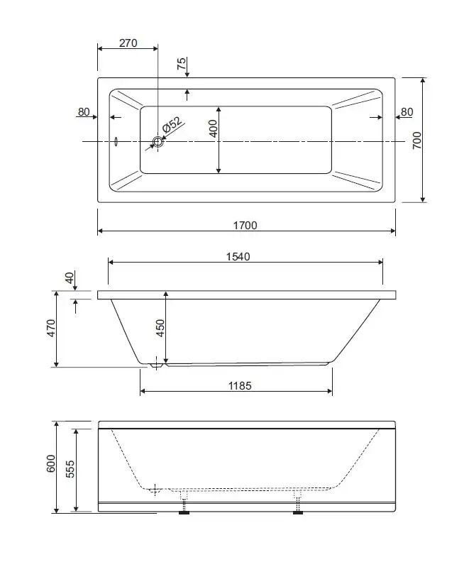Акриловая ванна CEZARES PLANE SOLO-170-70-45-W37
