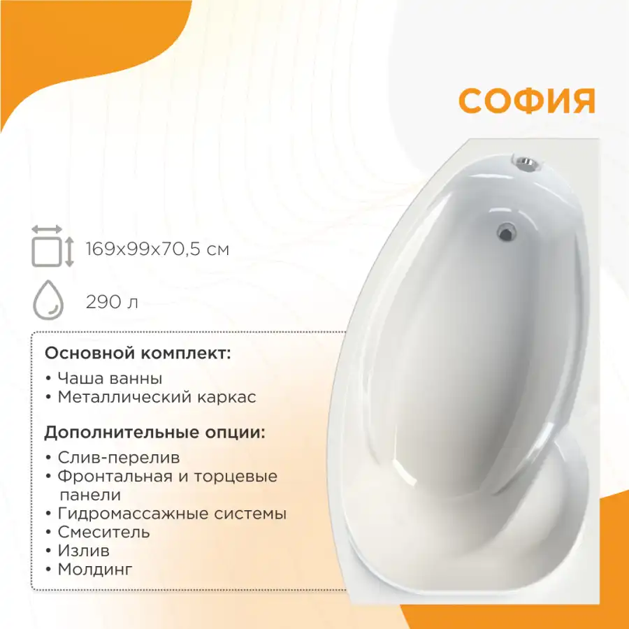Акриловая ванна Vannesa "София" 169x99 см правая изготовлена из 100% листа акрила толщиной 5 мм.