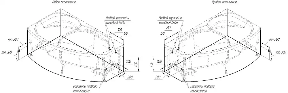 Основная цена указана за ванну, установленную на каркас с ножками.