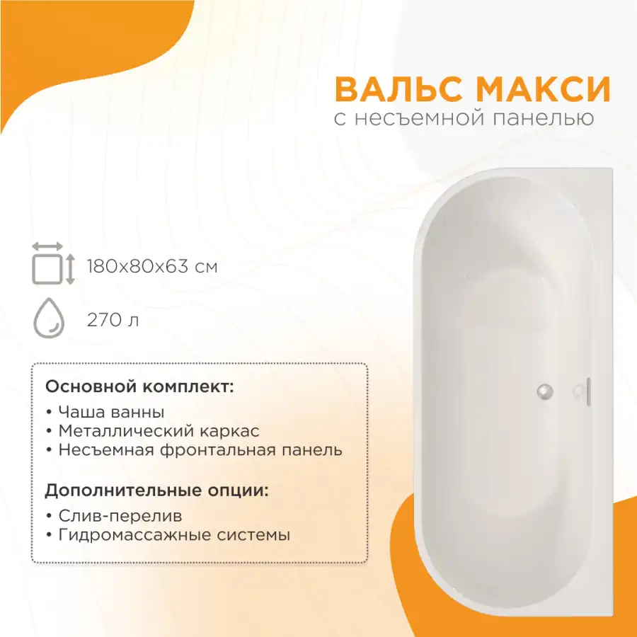 Акриловая ванна Radomir ВАЛЬС МАКСИ 180х80 имеет современный минималистичный дизайн, покоряет своей выразительностью и создает особенную, легкую атмосферу в ванной комнате. Пристенная ванна с мягкими контурами и тонкими боковыми стенками смотрится невероятно стильно, соответствуя актуальным тенденциям в дизайне. Особенностью этой модели является два варианта фронтальной панели: