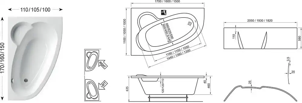 Габариты: длина 150/160/170 см, ширина 100/105/110 см, объем 190/215/240 л