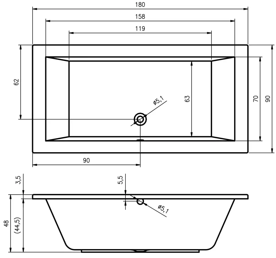 Ванна изготовлена из литьевого акрила толщиной 6-8 мм.