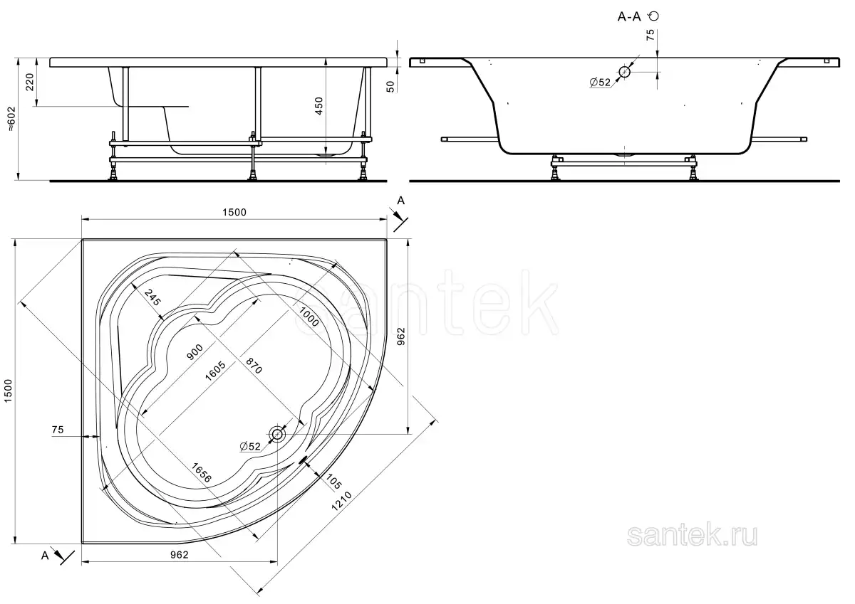 Удобные размеры 150x150 см создают обстановку роскоши и комфорта. Форма ванны Канны разработана с учетом эргономики, обеспечивая идеальную посадку для полного расслабления. Современные технологии производства гарантируют долгий срок службы и легкость ухода за изделием.