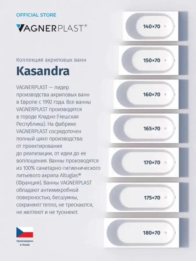 Акриловая ванна Vagnerplast Kasandra 175x70x45 см. Компактная прямоугольная модель ванны Kasandra из акрила, легко расположиться в небольшой ванной комнате, придав интерьеру наиболее совершенный и эстетичный внешний вид. Несмотря на свои маленькие размеры 170х70см, чаша ванны характеризуется отличной вместимостью и имеет большую ёмкость в 250 литров.