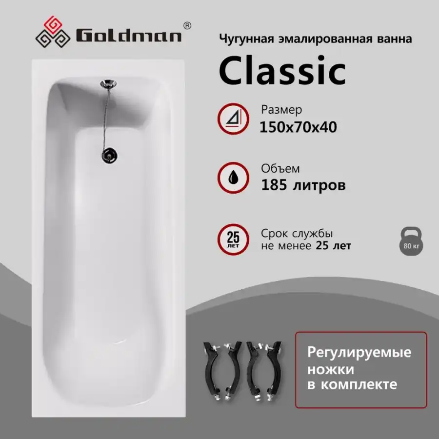 Чугунная ванна Goldman Classic 150*70*40 с ножками