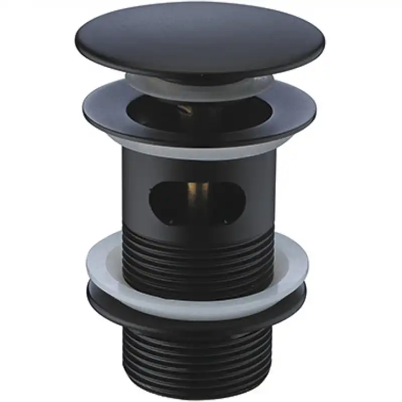 Донный клапан для раковины CeramaLux BB005B с переливом, Черный глянцевый с системой Click-Clack, управляется нажатием на пробку слива.