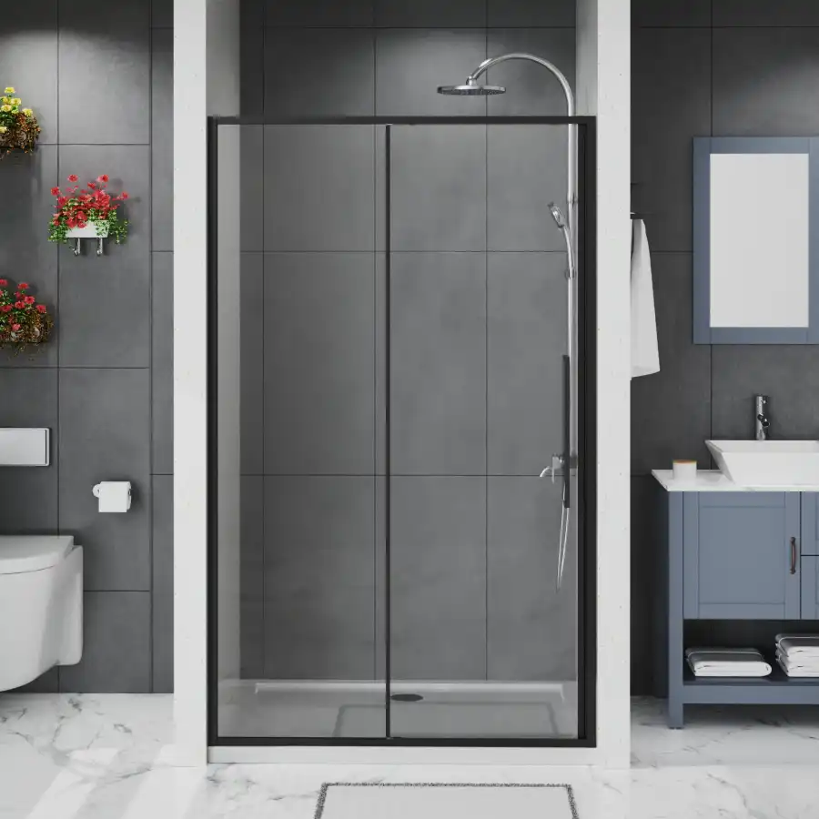 Дверь в нишу Раздвижная, с универсальной (L/R) откатной дверью, на двойных роликах с нержавеющими подшипниками. Ручки выполнены из латуни в цвет профиля. Все стекла имеют толщину 6 мм. Профиль выполнен из анодированного алюминия.