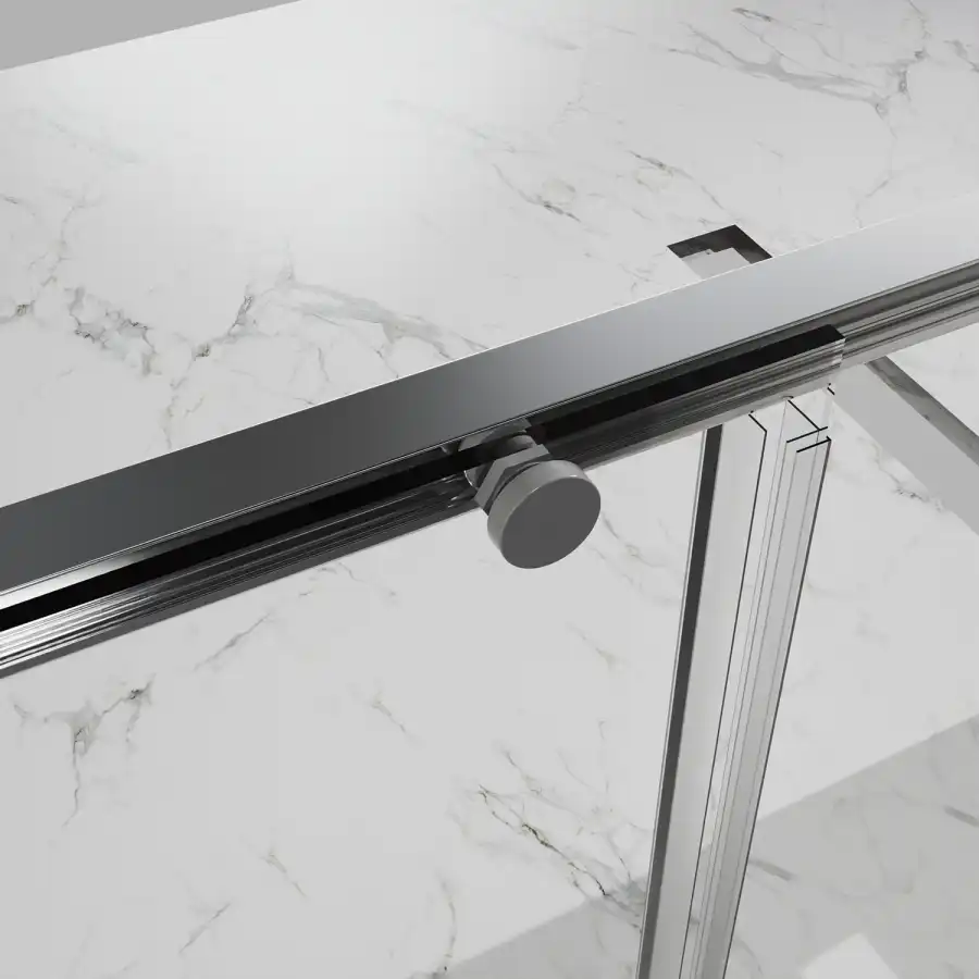 Дверь в нишу Раздвижная, с универсальной (L/R) откатной дверью, на двойных роликах с нержавеющими подшипниками. Ручки выполнены из латуни в цвет профиля. Все стекла имеют толщину 6 мм. Профиль выполнен из анодированного алюминия.