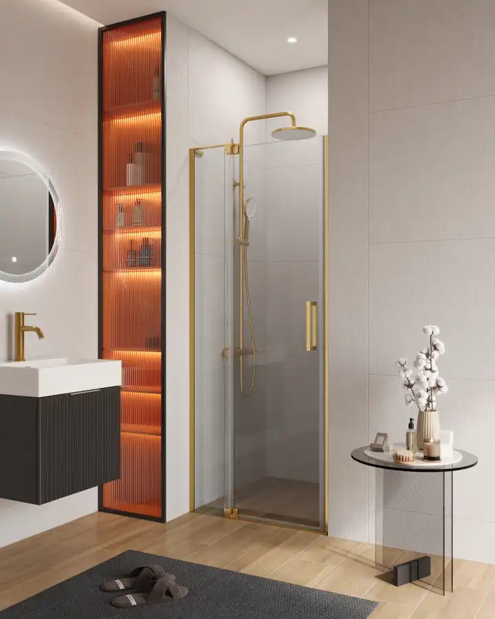 Душевая дверь в нишу CEZARES SLIDER-B-1-80/90-C-BORO профиль Брашированное золото, Прозрачное стекло 8 мм. Конструкция дверей - Распашная.