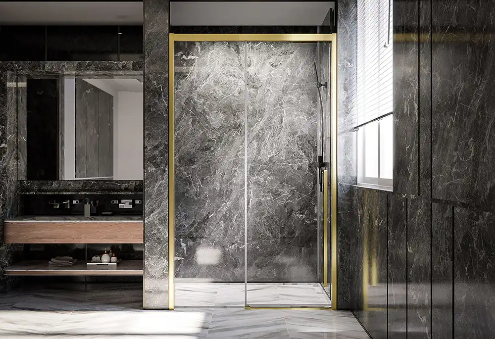 Душевая дверь Veconi Premium Trento PTD-30G 150 см, PTD30-G-150-01-C4, профиль Брашированное золото, стекло Прозрачное