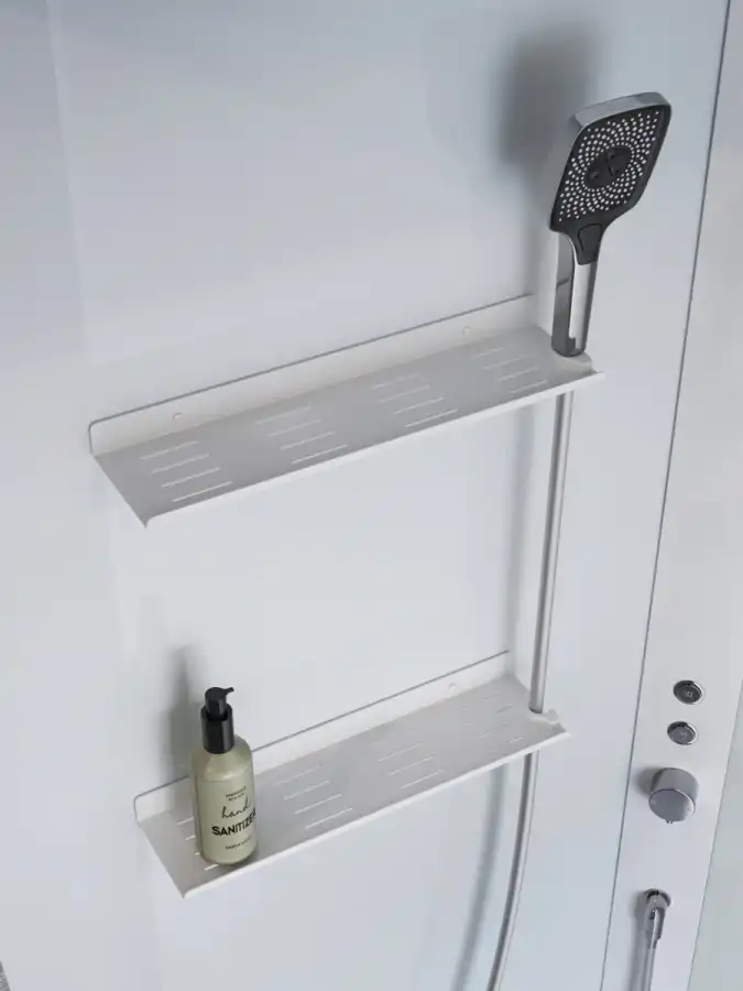 Две металлические полки со встроенными держателями для лейки обеспечат место для хранения внутри кабины.