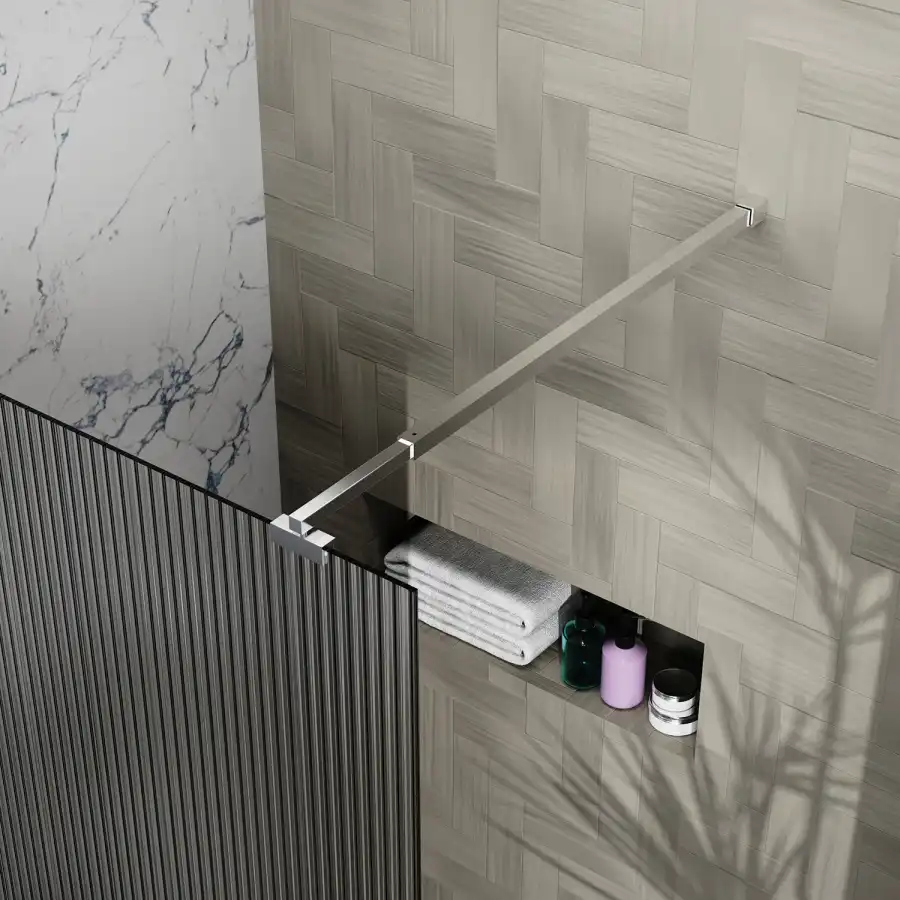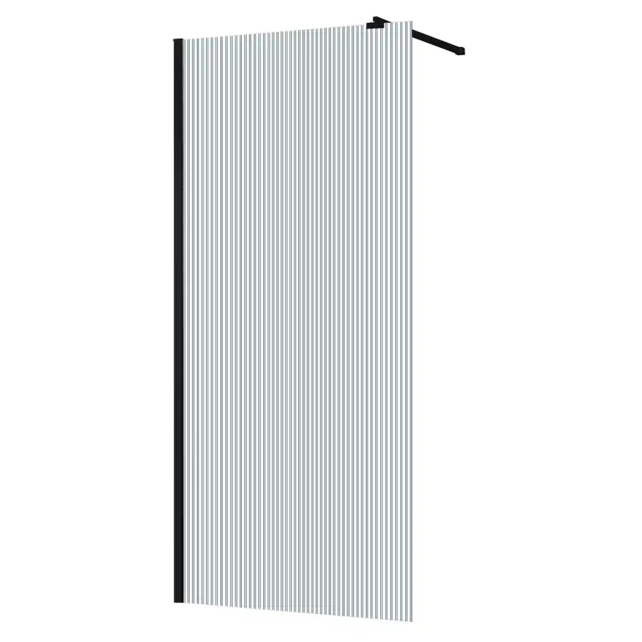 Минималистичная и современная душевая перегородка с универсальной установкой (L/R), телескопическим кронштейном и возможностью его регулировки до 1,2 м. Кронштейн выполнен из латуни в цвет профиля. Закаленное стекло представлено в рифленом исполнении и имеет толщину 8 мм. Профиль выполнен из анодированного алюминия.