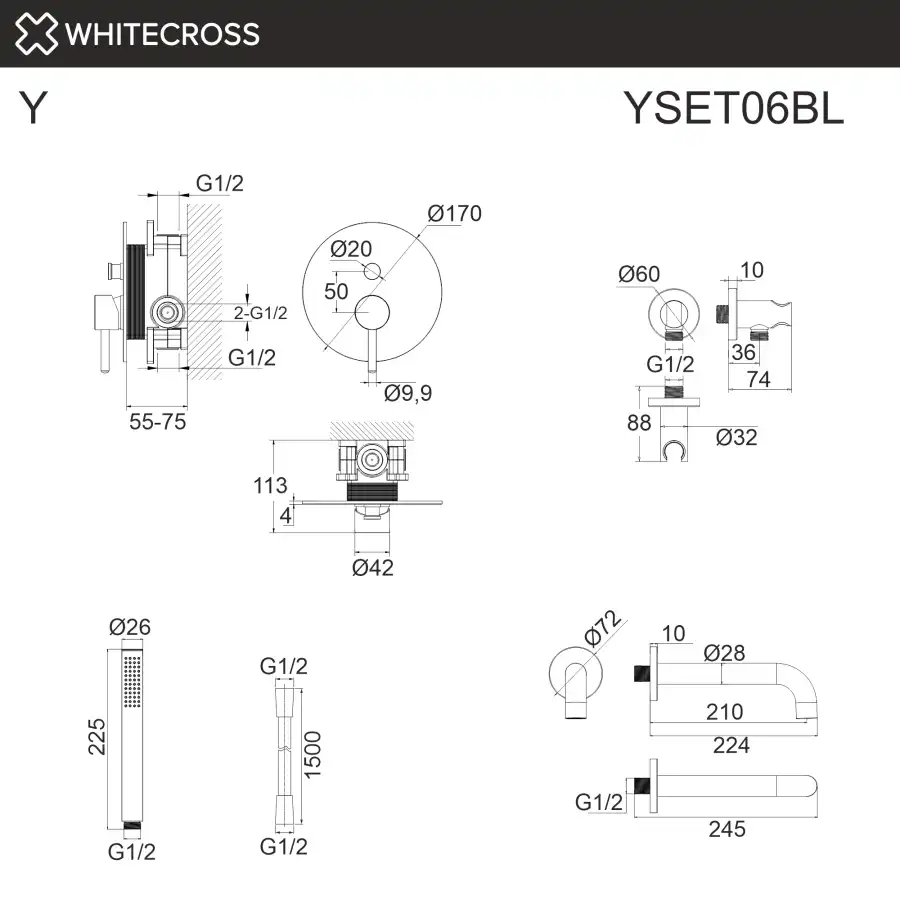 Душевая система для ванны, скрытого монтажа WHITECROSS Y black, Черный матовый, YSET06BL