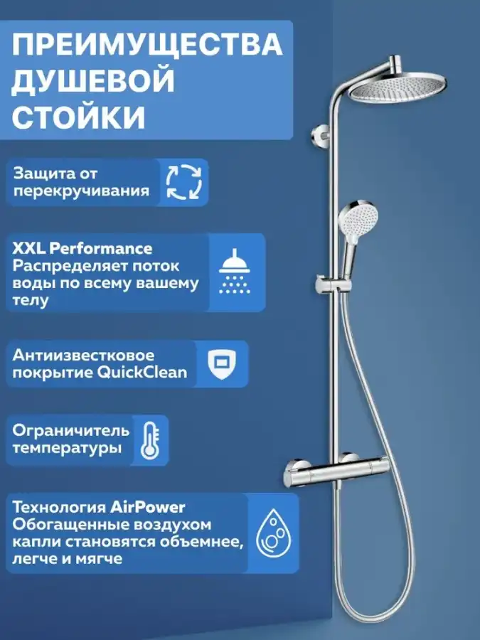 Свежий облик Crometta порадует любителей современных ванных комнат, не подвластных времени. Прекрасные ощущения при принятии душа по отличной цене. Простой ассортимент от ручного душа до душевой системы идеально подходит для быстрого ремонта. Регулируемый по вертикали душевой ползунок позволяет переместить ручной душ в наиболее удобное положение для принятия душа. Очень большой верхний душ обеспечивает незабываемые моменты принятия душа. Никогда еще не было так приятно стоять под дождем. Известковый налет и грязь можно просто стереть пальцем. Минимальные усилия по очистке.