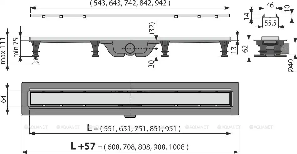 Душевой лоток AlcaPlast APZ20-850 Simple с решеткой под плитку, с рамкой / Нержавеющая сталь