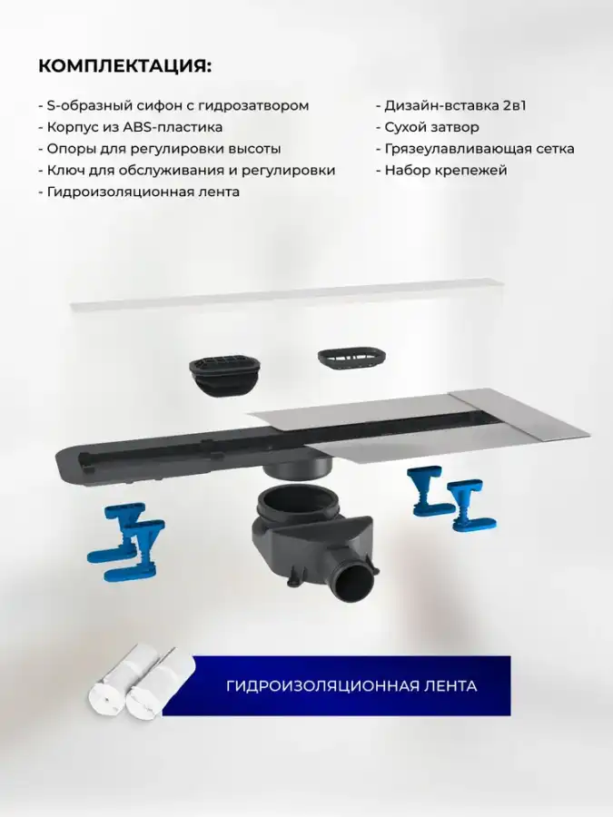 Полная комплектация — регулируемые опоры, крепеж, гидроизоляционная лента, ключ для обслуживания.