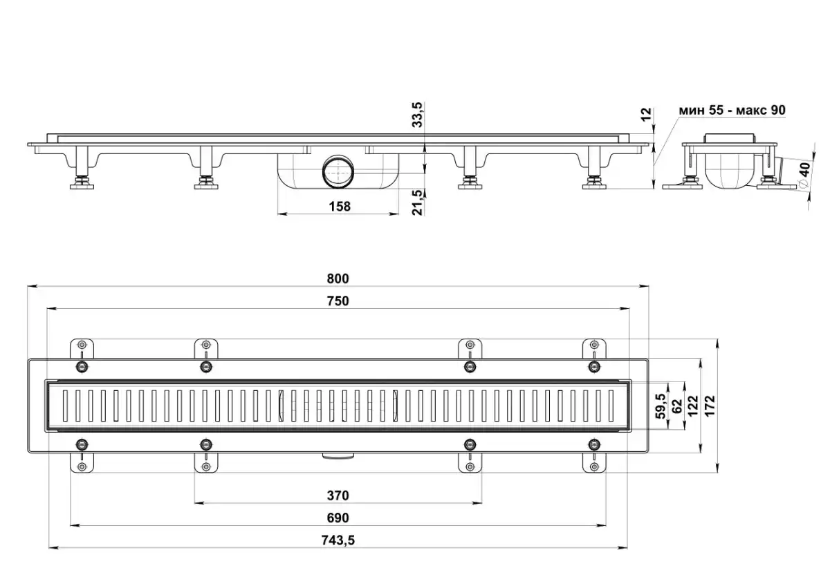 Душевой лоток Good Door 750 с перфорированной решеткой, комбинированный затвор ТЛ00005, Серый / серебристый