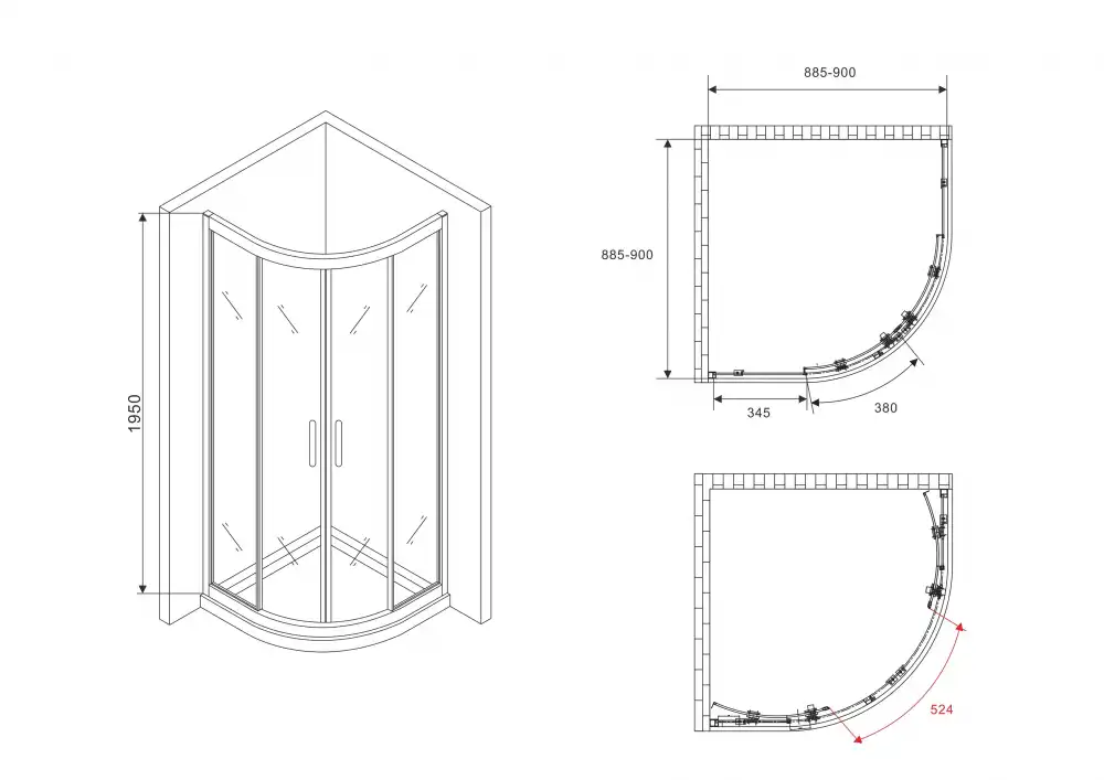 Душевой уголок Abber Schwarzer Diamant AG01090B, размер 90х90х195 см, стекло Прозрачное 6 мм, профиль Черный. Конструкция дверей раздвижная. Форма Четверть круга. Поддон приобретается отдельно.