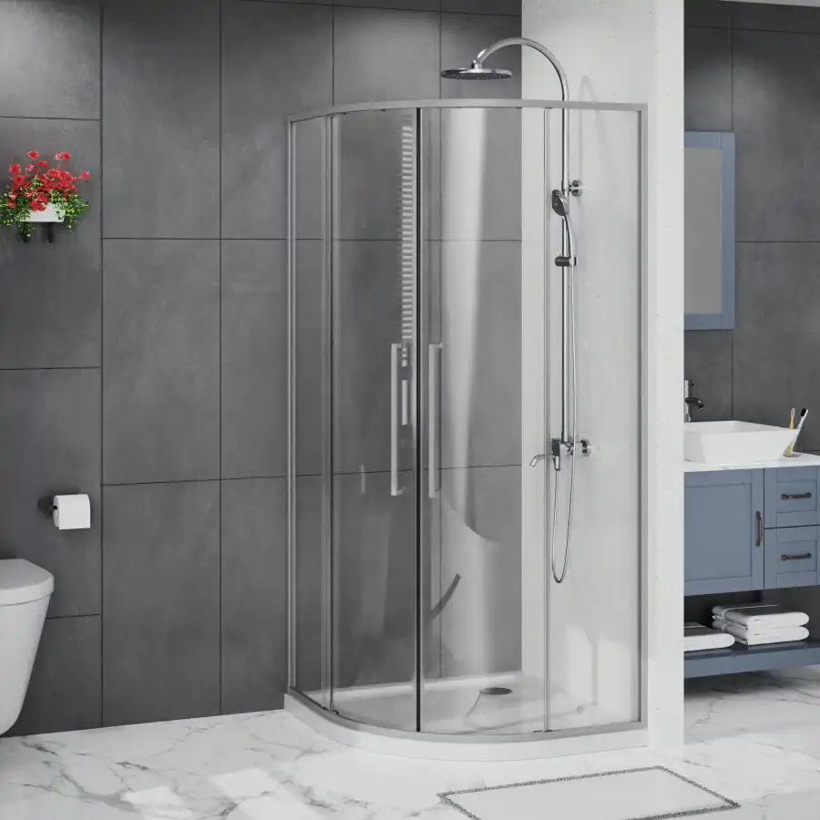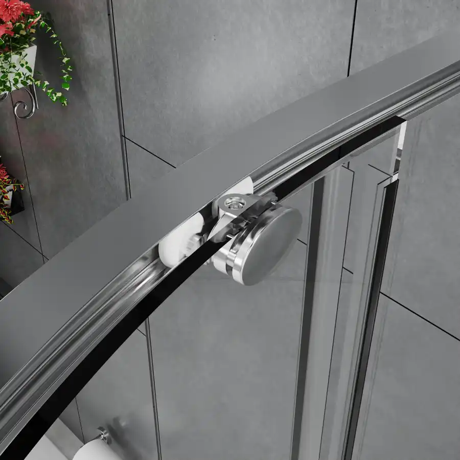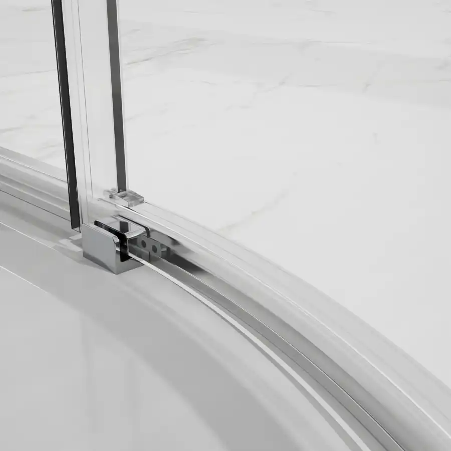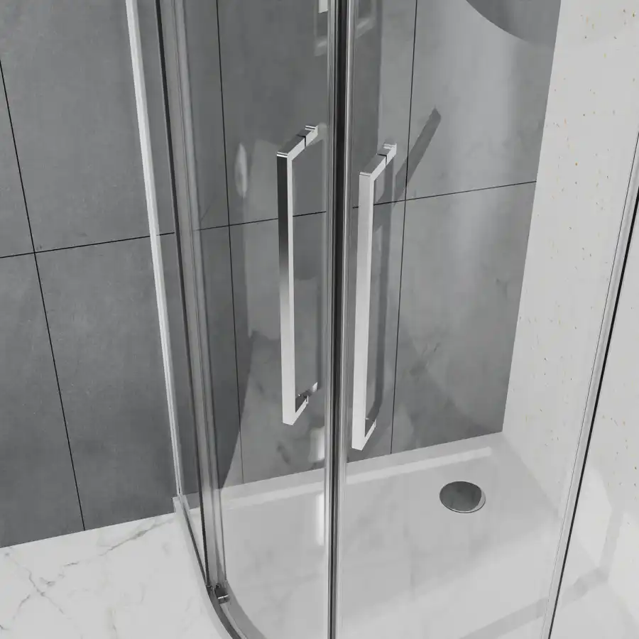 Радиусный Душевой Уголок 1/4 круга ВХОД С УГЛА, с двумя раздвижными дверьми, на двойных роликах с нержавеющими подшипниками. Ручки выполнены из латуни в цвет профиля. Все стекла имеют толщину 6 мм. Профиль выполнен из анодированного алюминия.