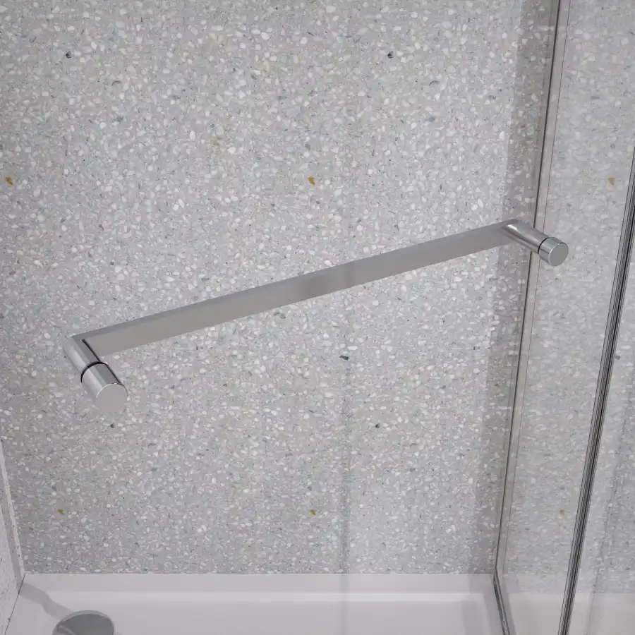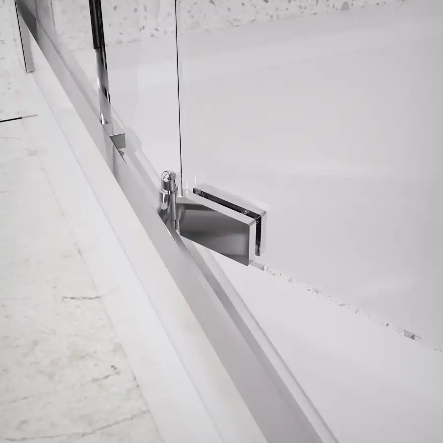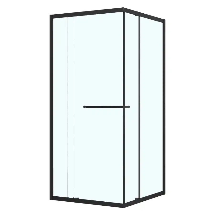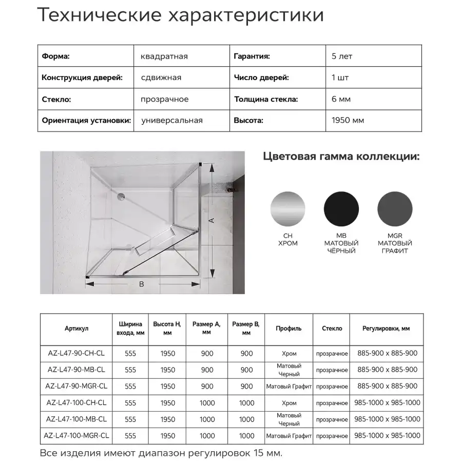 Квадратный душевой уголок, с одной сдвижной дверью, на специальных усиленных и бесшумных роликах на нержавеющих подшипниках. Ручки выполнены из латуни в цвет профиля. Все стекла имеют толщину 6 мм. Профиль выполнен из анодированного алюминия.