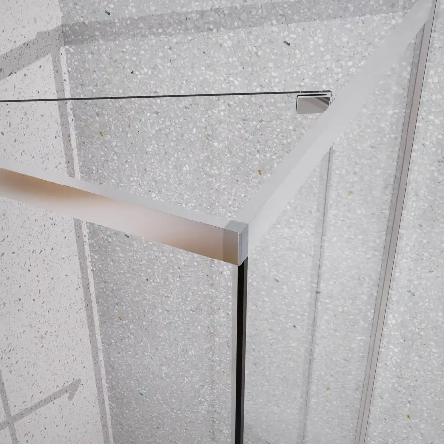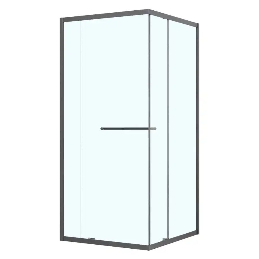 Квадратный душевой уголок, с одной сдвижной дверью, на специальных усиленных и бесшумных роликах на нержавеющих подшипниках. Ручки выполнены из латуни в цвет профиля. Все стекла имеют толщину 6 мм. Профиль выполнен из анодированного алюминия.