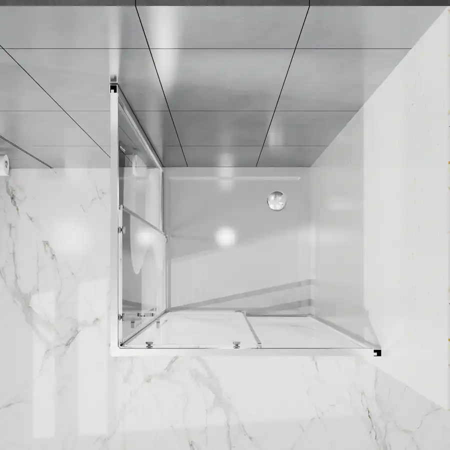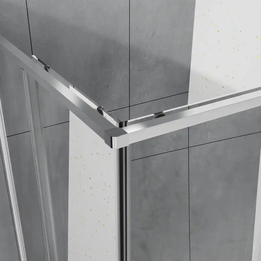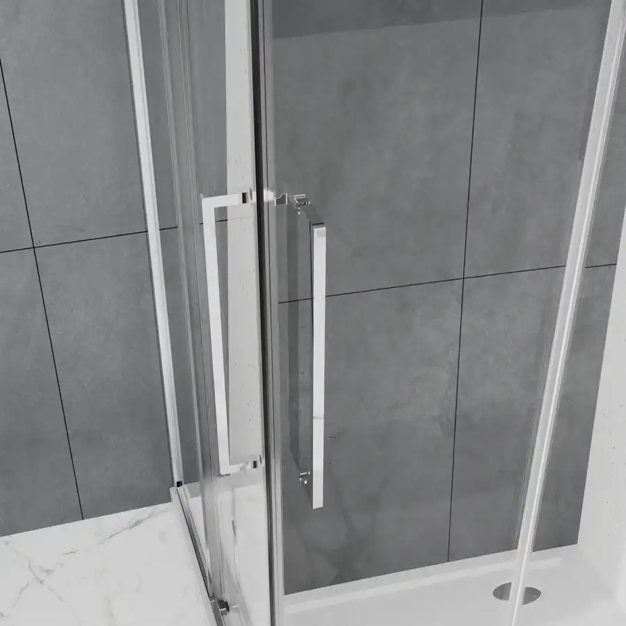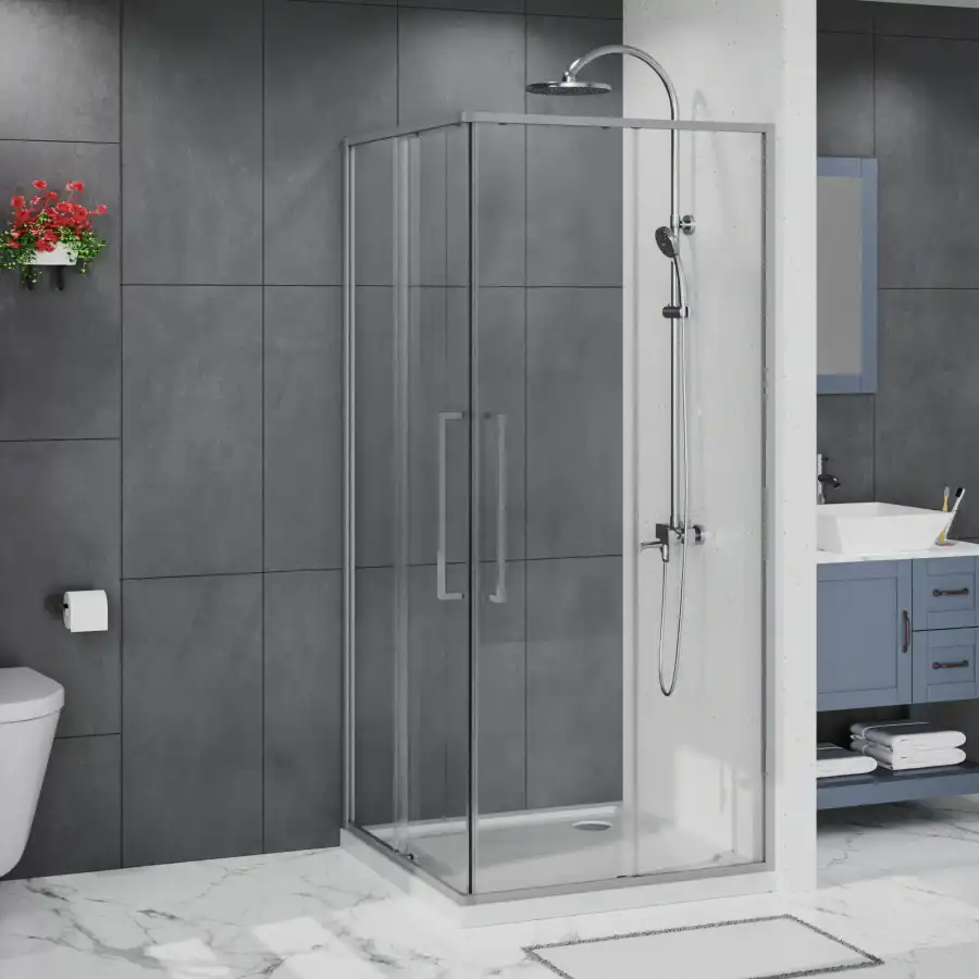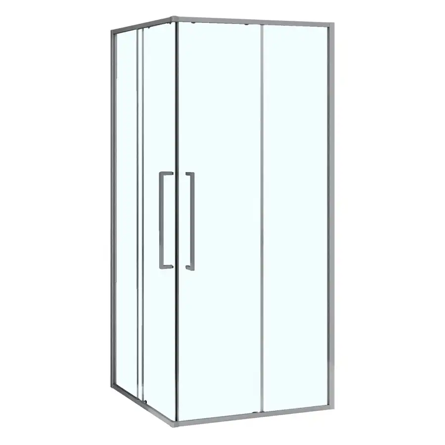 Душевой Уголок Квадратный, ВХОД С УГЛА, с двумя раздвижными дверьми, на двойных роликах с нержавеющими подшипниками. Ручки выполнены из латуни в цвет профиля. Все стекла имеют толщину 6 мм. Профиль выполнен из анодированного алюминия.