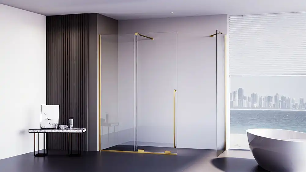 Душевой уголок Veconi Premium Trento 140х80 PTC50-SP-14080-G-01-C4, стекло Прозрачное профиль Брашированное золото, конструкция двери Раздвижная