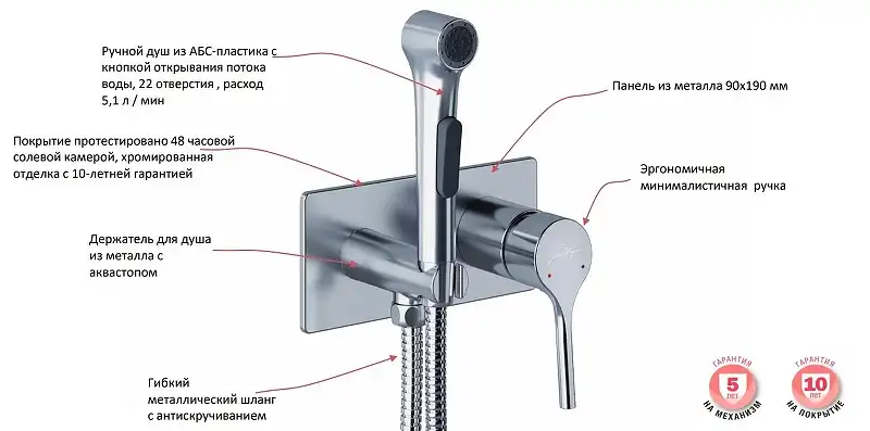 Гигиенический душ со смесителем Jacob Delafon Elate E25838-CP. Характеристики: Цвет: хром. Материал: латунь. пластик. Тип управления: однорычажный. Механизм: керамический картридж. Держатель для душа с аквастопом. Расход воды: 5.1 л/мин. Гигиенический душ из пластика: диаметр 3,4 см (22 отверстия). Гибкий металлический шланг с антискручиванием: 120 см. Стандарт подводки: G 1/2. Монтаж: встраиваемый. В комплекте поставки: Смеситель (внешняя и внутренняя часть). Гигиенический душ. Держатель для гигиенического душа. Шланг.