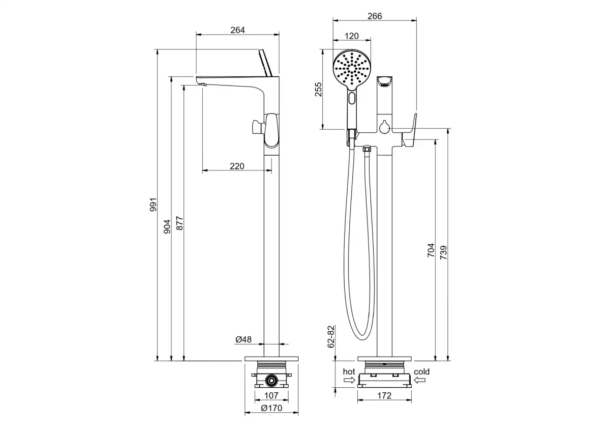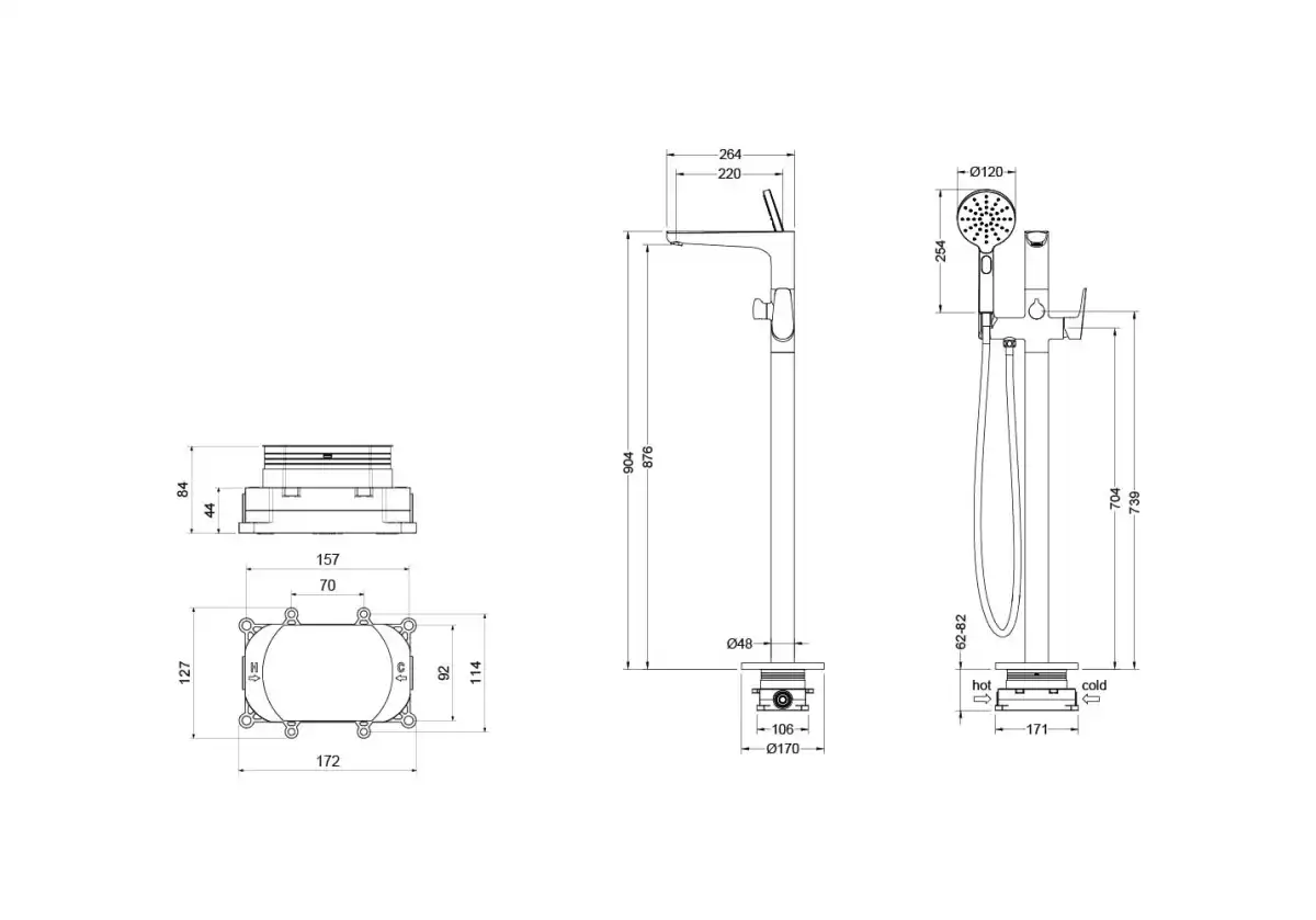 Комплектация1. Смеситель (внешняя и скрытая часть) 2. Ручная лейка 3. Шланг для лейки 150 см 4. Держатель для ручной лейки 5. Дивертор (переключатель потоков) 6. Декоративная накладка на пол