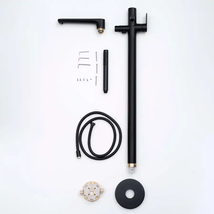 Комплектация1. Смеситель 2. Ручная лейка 3. Шланг для лейки 150 см 4. Держатель для ручной лейки 5. Дивертор (переключатель потоков) 6. Декоративная накладка на пол 7 Крепление для смесителя