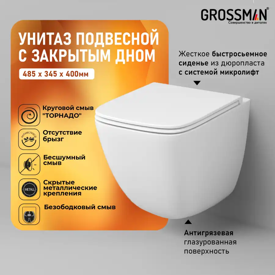 Унитаз подвесной Grossman GR-4497SQC (485х345х400) безободковый,белый с тонкой крышкой,микролифт,смыв торнадо,закрытое дно.