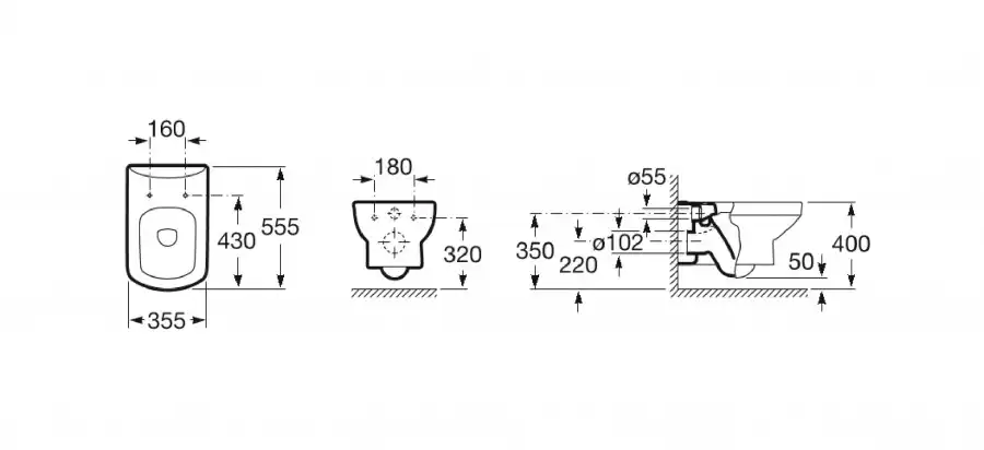 ROCA | DAMA SENSO чаша унитаза подвесная 355x555x350 мм, с горизонтальным выпуском, белый