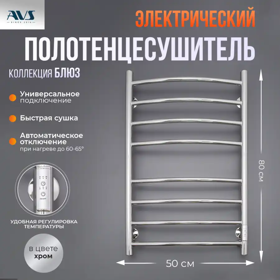 Полотенцесушитель электрический 50x80 AVS Блюз с терморегулятором, хром, 831-E004-5080-CR
