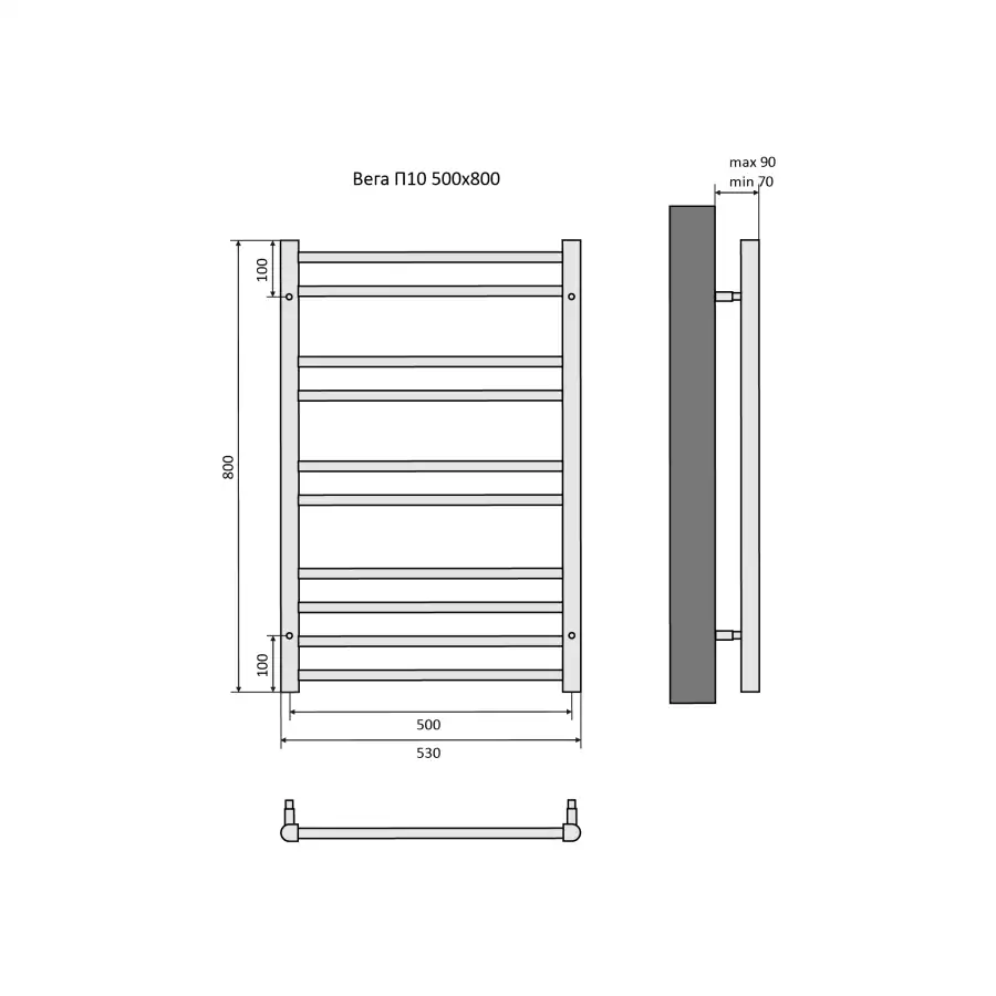 Полотенцесушитель водяной Aquatek Вега AQ DR1080CH 50х80 П10 лесенка, 10 перекладин, нижнее/диагональное подключение 1/2" ВР, материал нержавеющая сталь, Хром