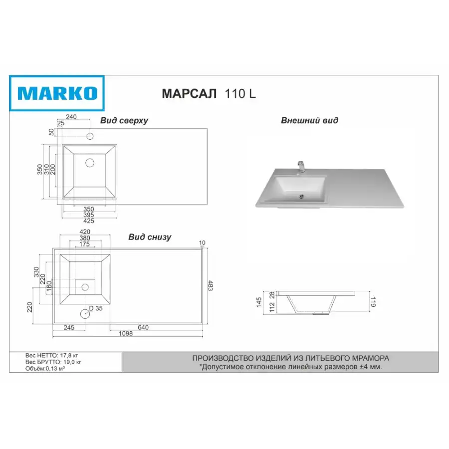 Материал раковиныЛитьевой мрамор