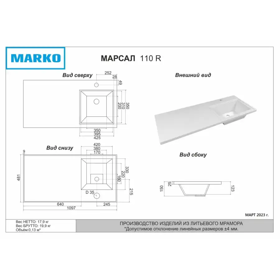Раковина из искусственного камня Marko Марсал 110 R правая, белая