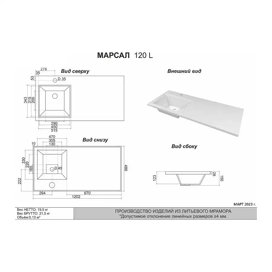 Раковина из искусственного камня Marko Марсал 120 L левая, белая