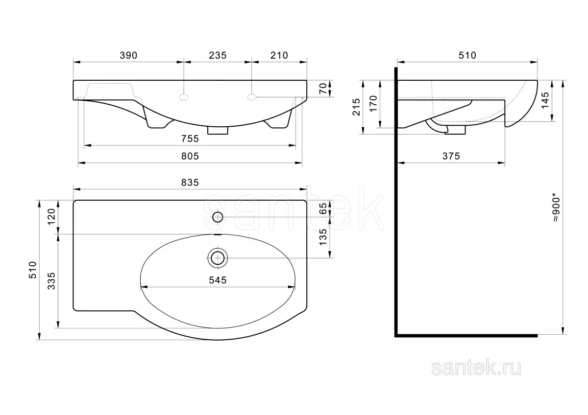 Раковина Santek Коралл 83 отверстие под смеситель 1WH110225 с левым крылом