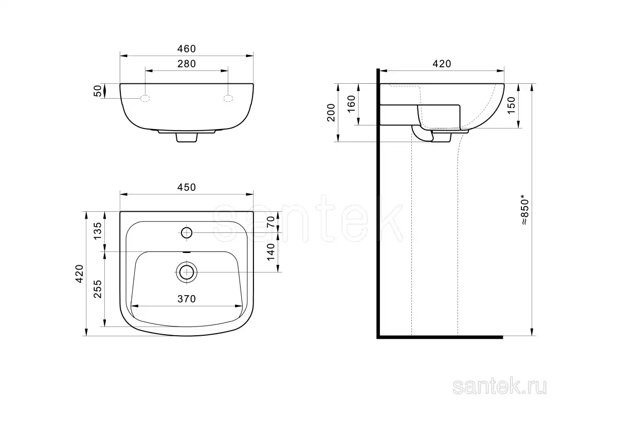 Раковина Santek Лонги 450х420 из фарфора выполнена в лаконичном дизайне и отличаются простыми, но изящными формами. Невысокий бортик по периметру препятствует попаданию воды за пределы раковины. На полочке прекрасно разместятся необходимые аксессуары. Возможен монтаж на кронштейны и с пьедесталом.