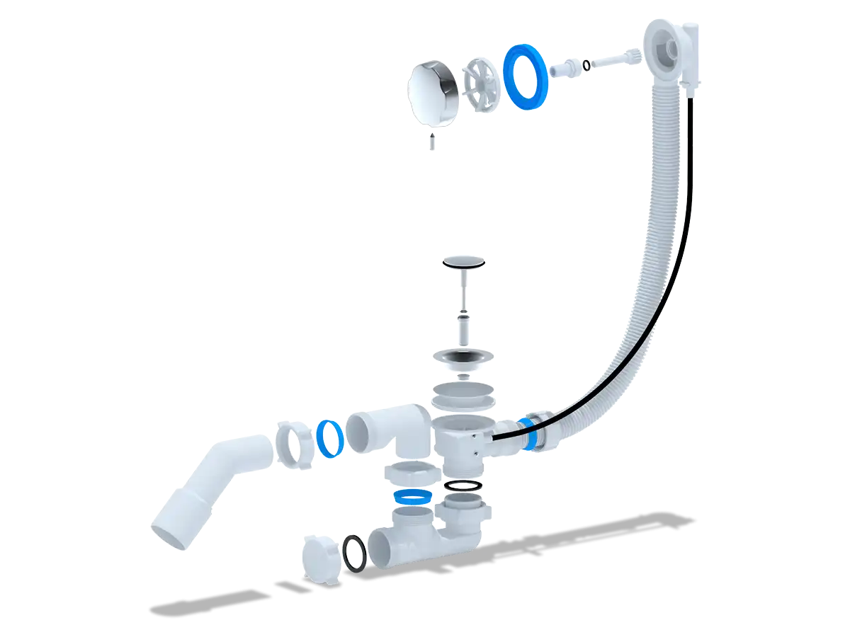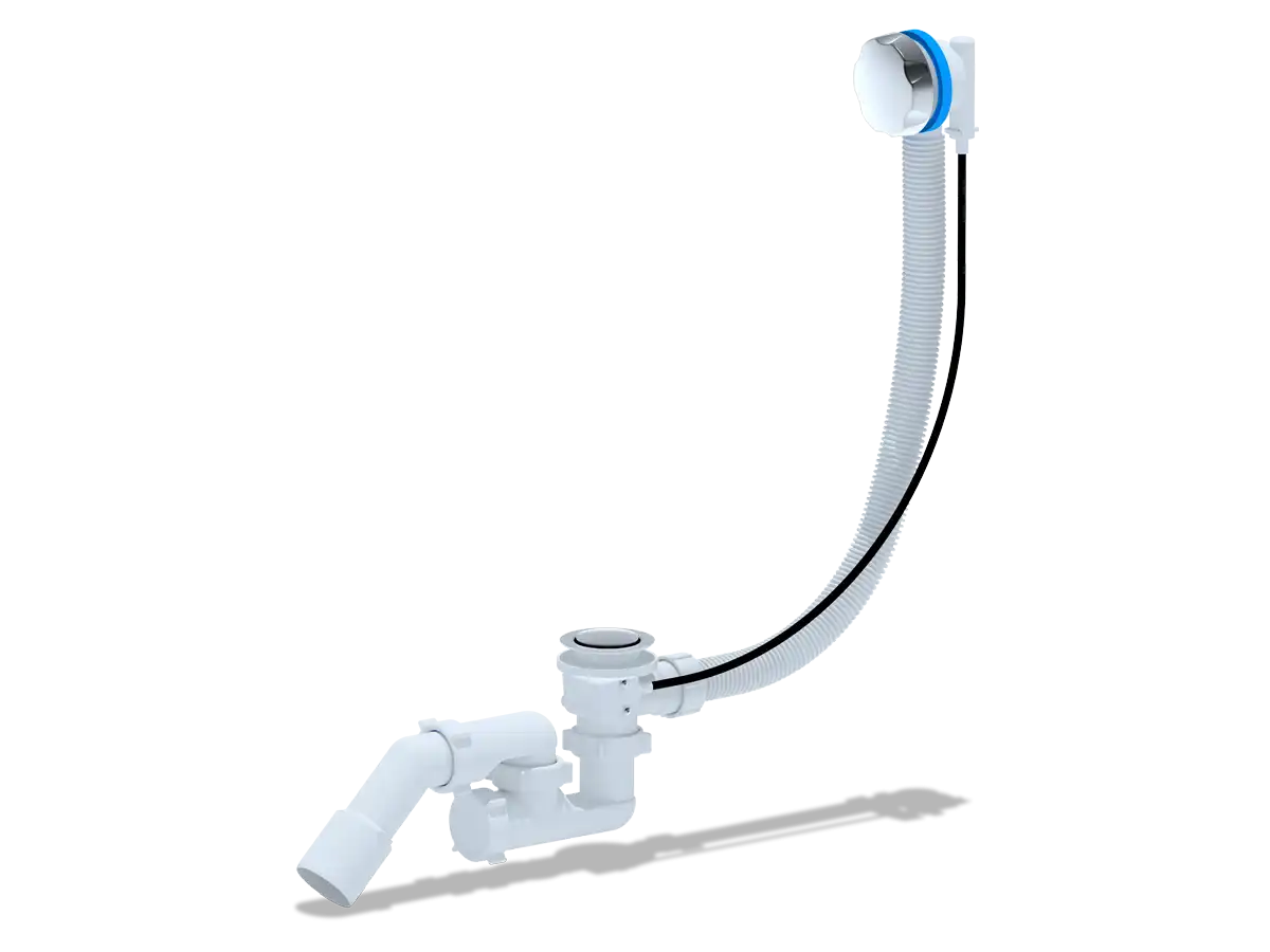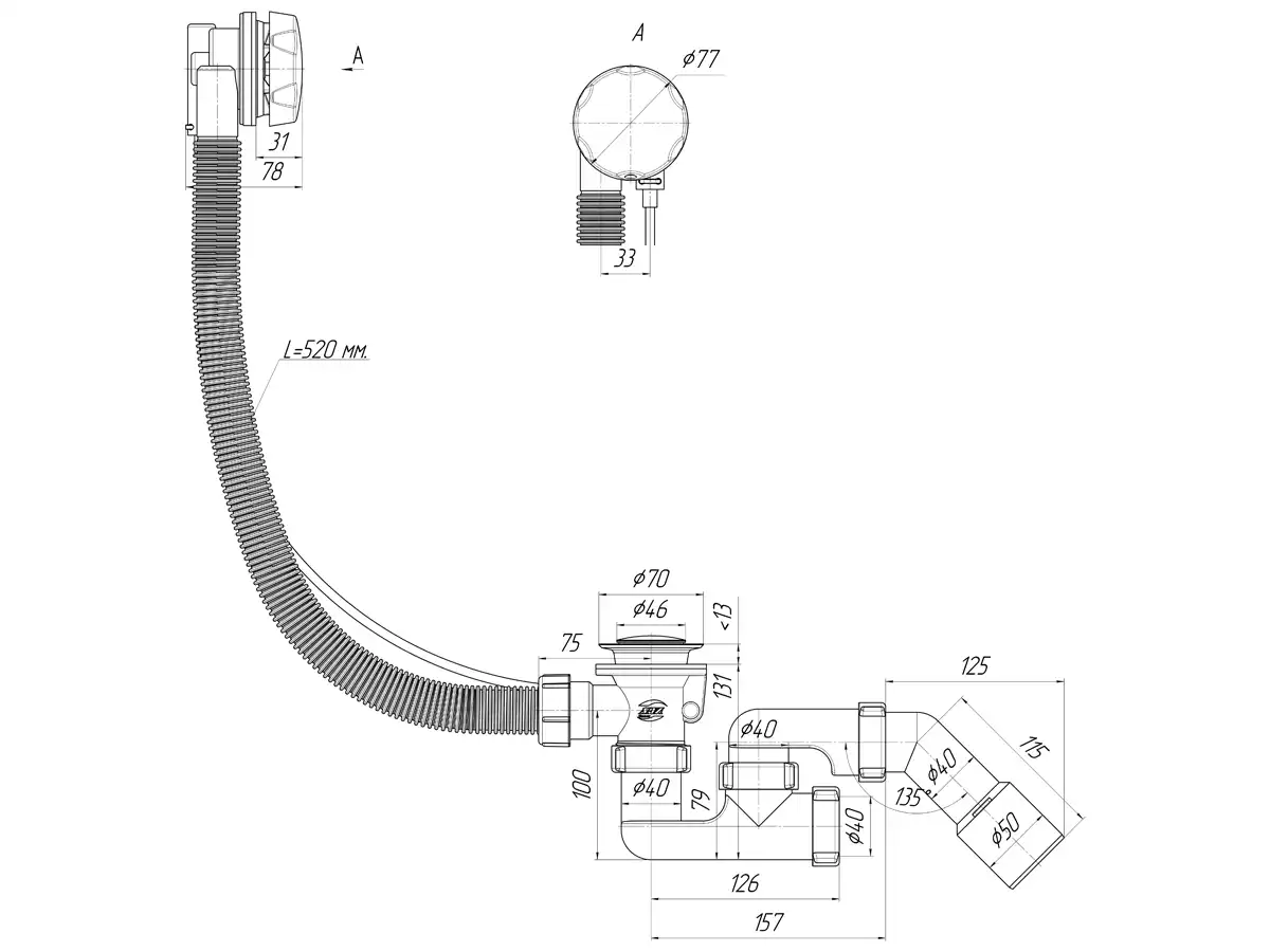 Перелив полуавтомат Ани Пласт EM321 для ванны с регулируемым сифоном, с переходной трубой 45° 40*50 580мм (ручка металл)